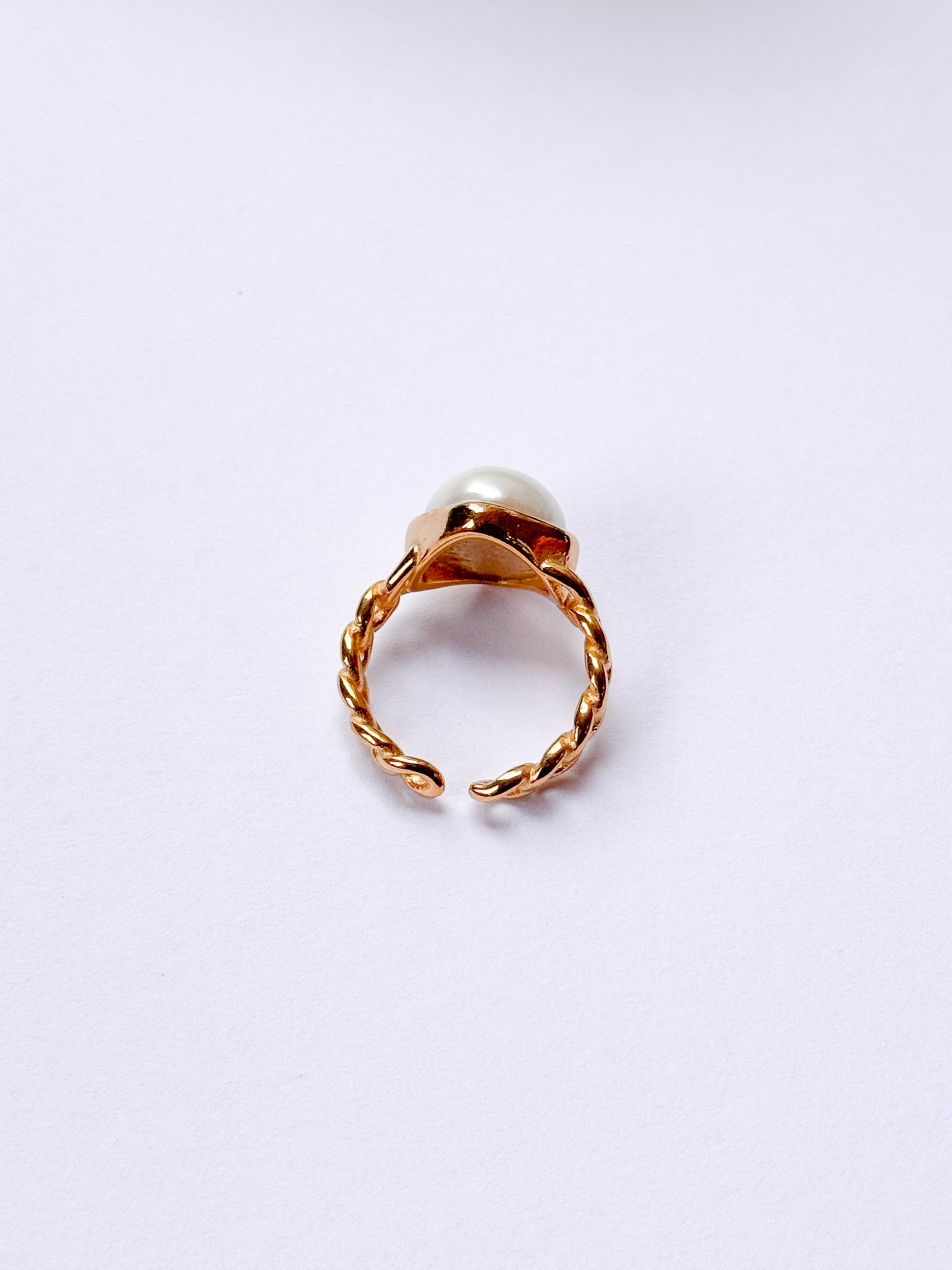 Anillo acero inoxidable dorado entrelazado con perla blanca