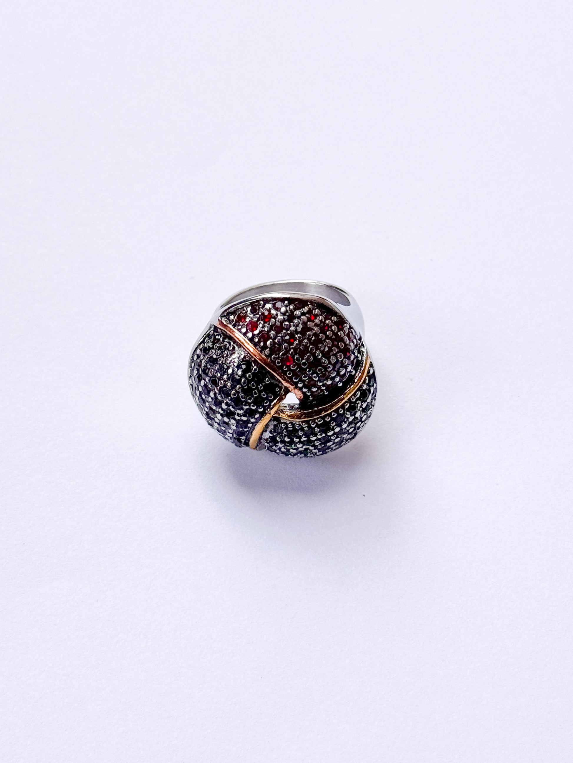 Anillo acero inoxidable dos oros, dorado y plateado de esfera con detalles envejecidos, brillantes negro, verde y rojo, enmarcado en dorado