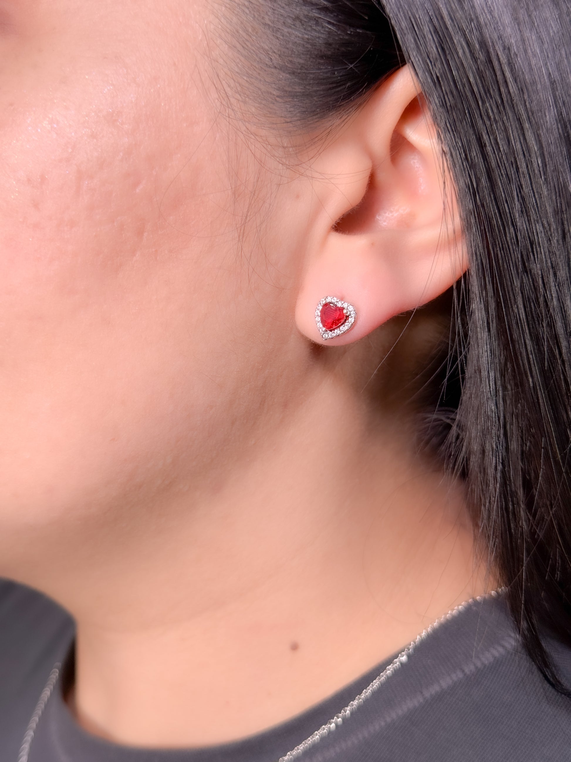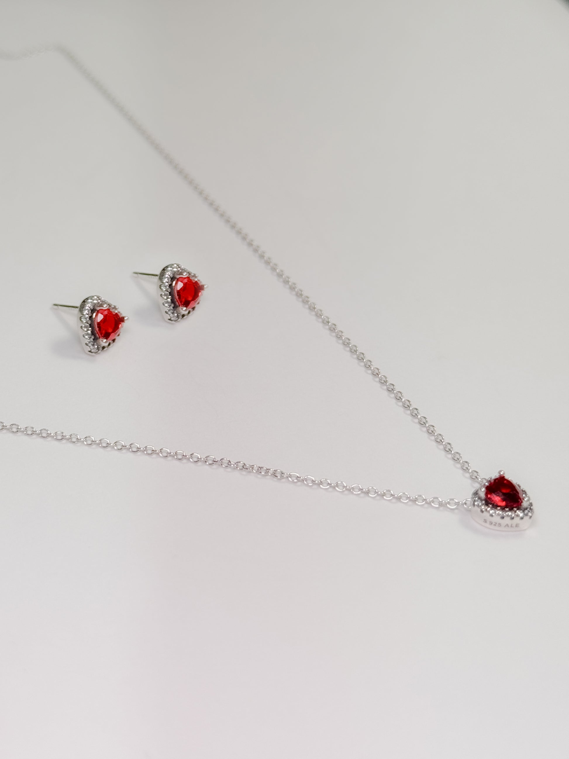 Juego en plata ley 925 con dije de corazón rojo o negro con marco en brillantes blancos (collar+cadena+topos)