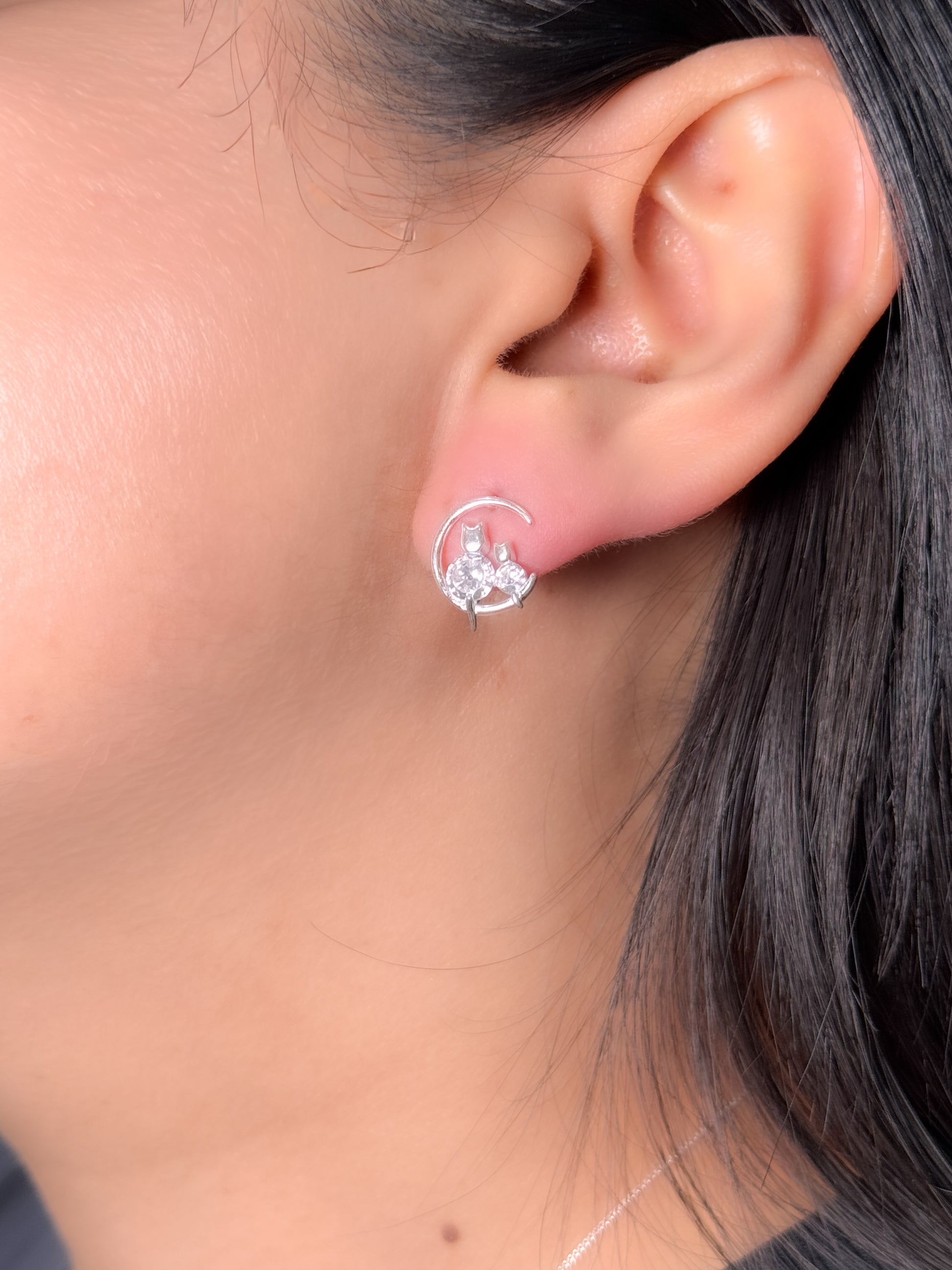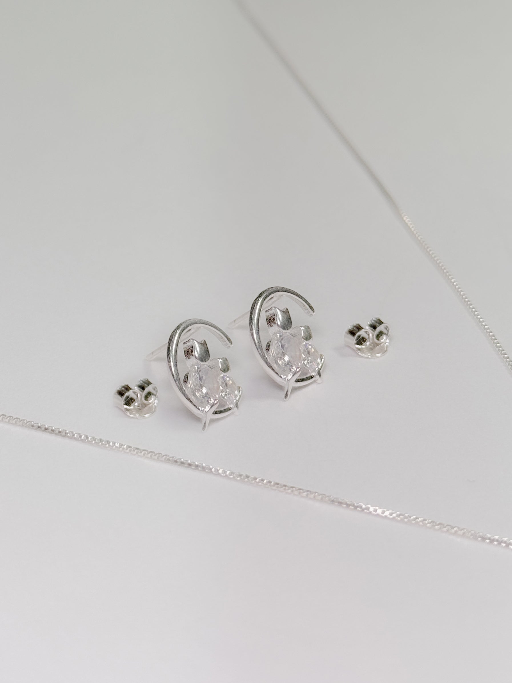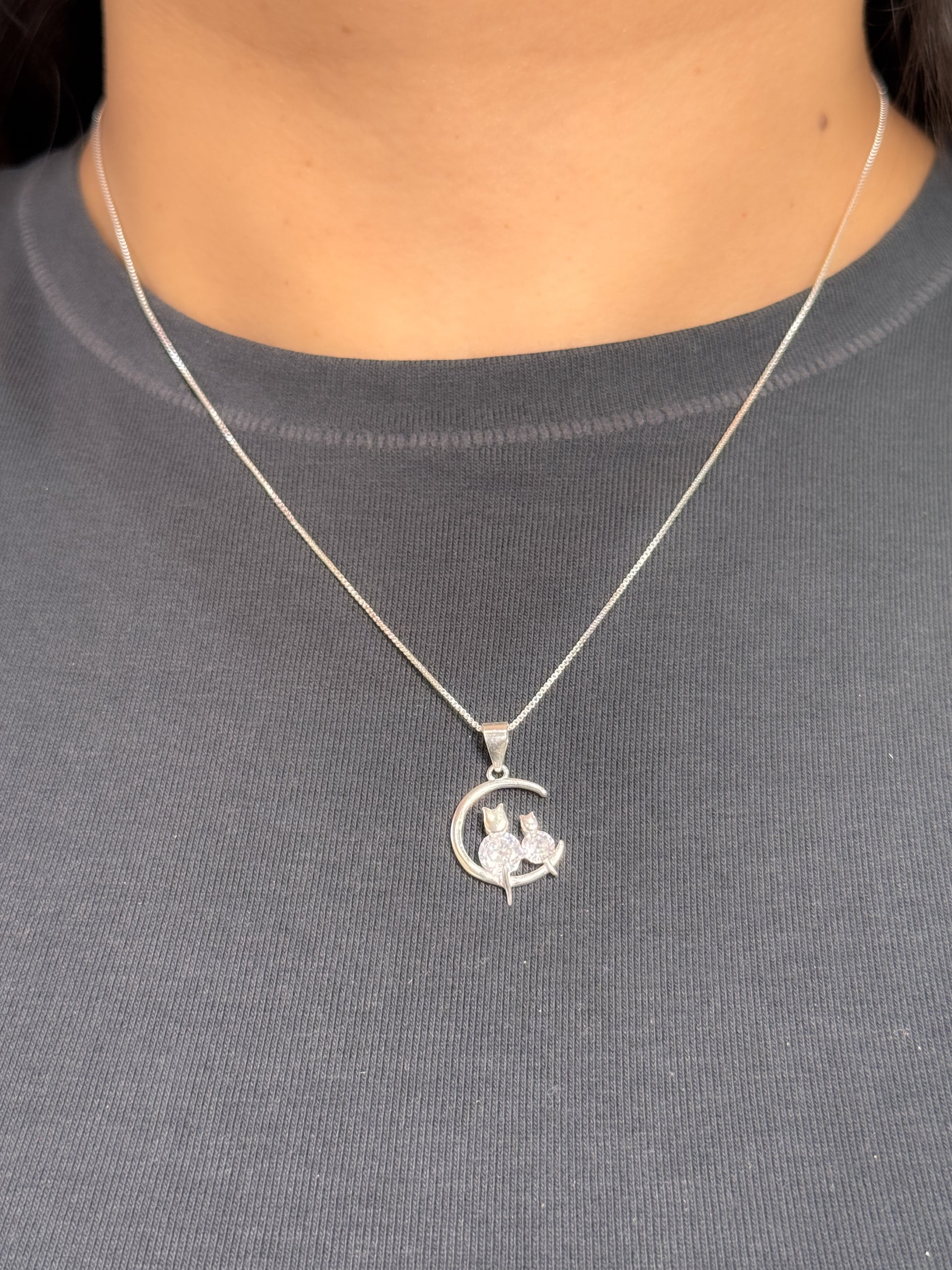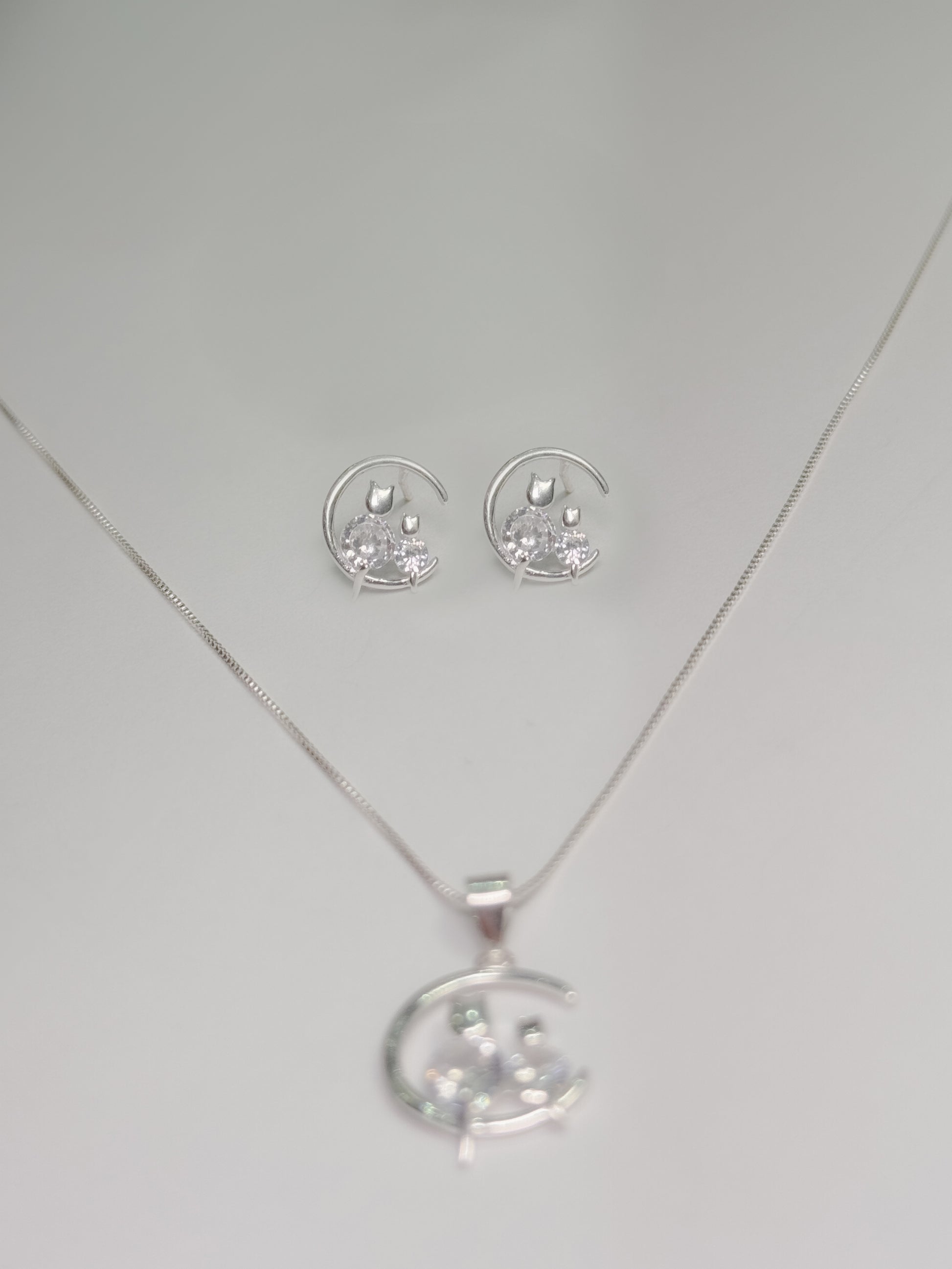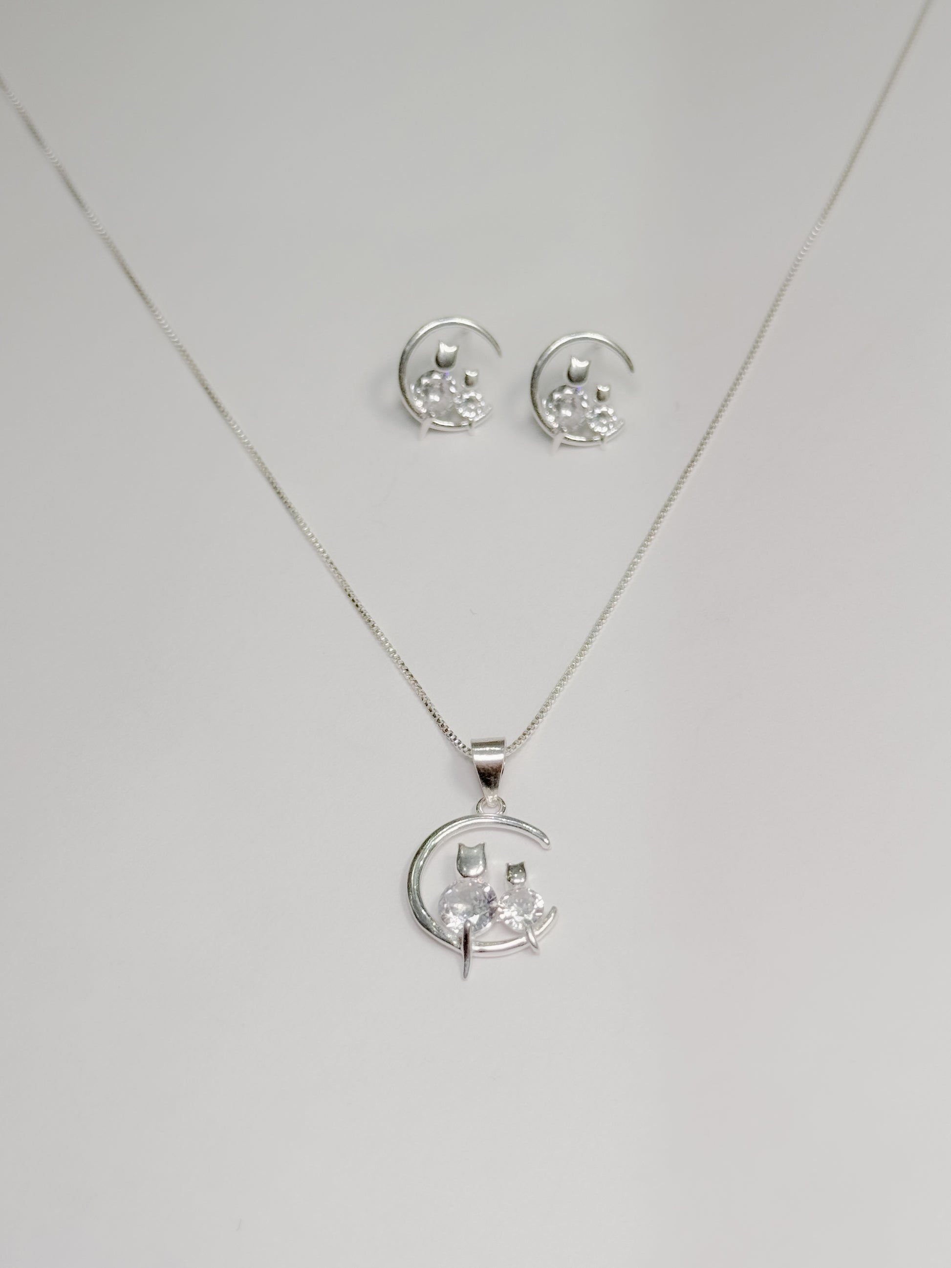 Juego de gatos en circón brillante plateado sentados en la luna (collar+cadena+topos)